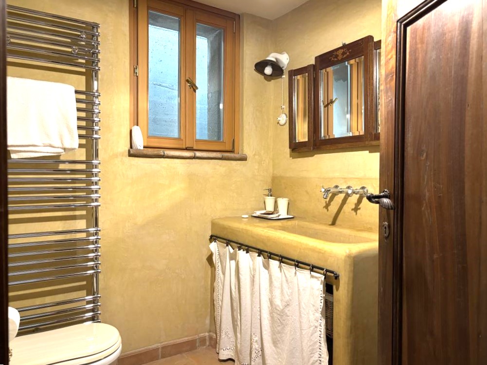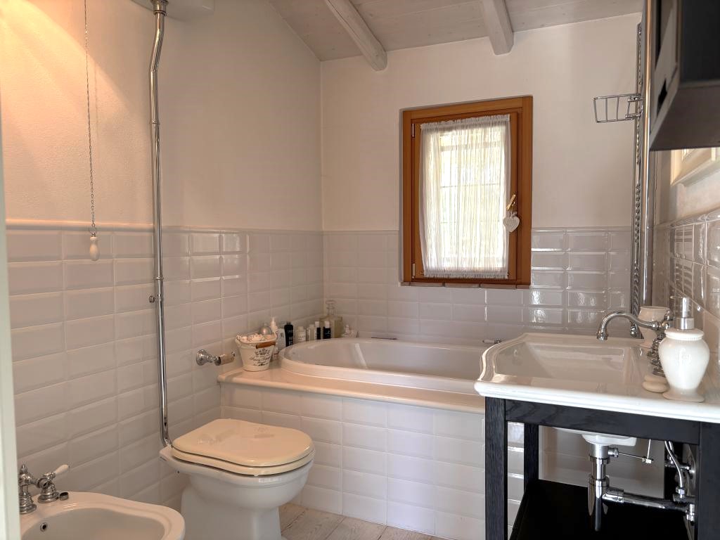 Finiture di pregio come il pavimento in cotto Impruneta fatto a mano che esalta il sapore rustico e genuino della casa, richiamando lo stile delle antiche case di campagna. Bagni con sanitari e rubinetterie Devon&Devon.