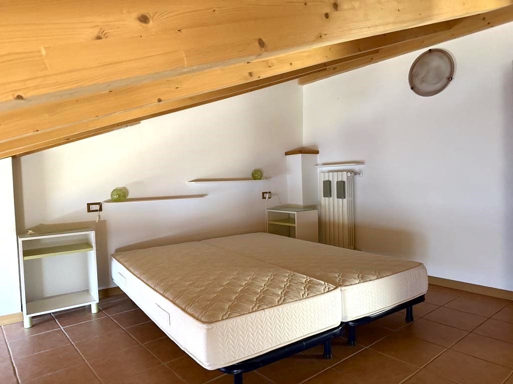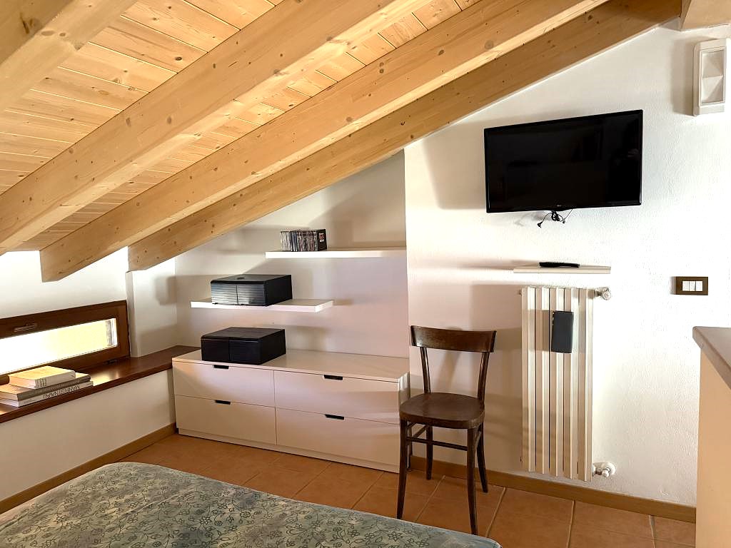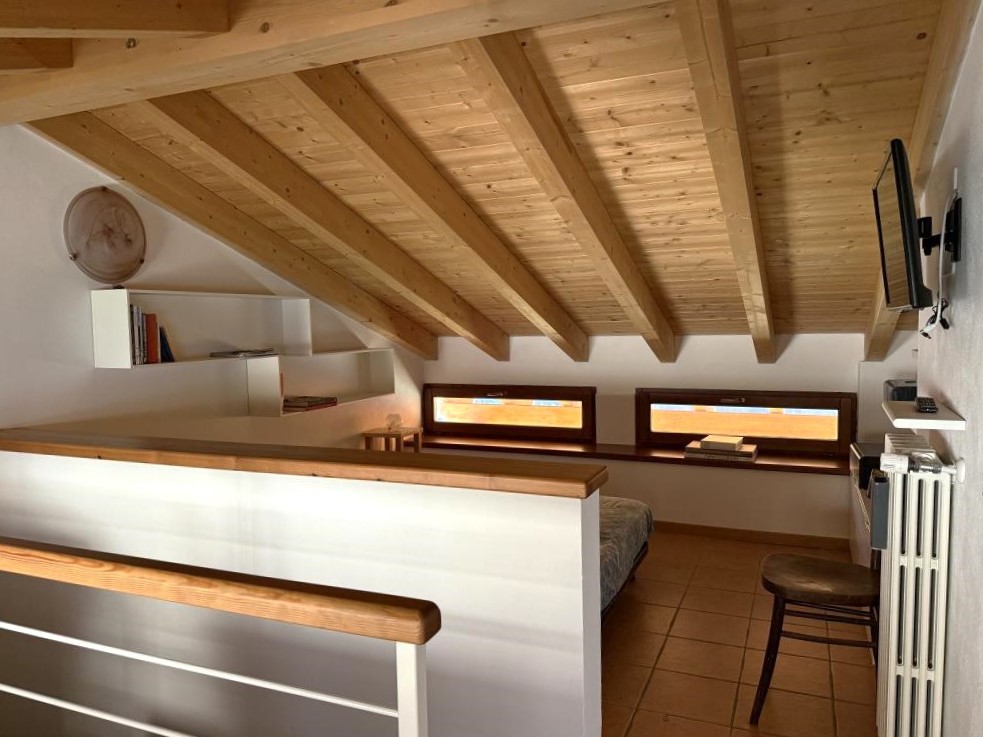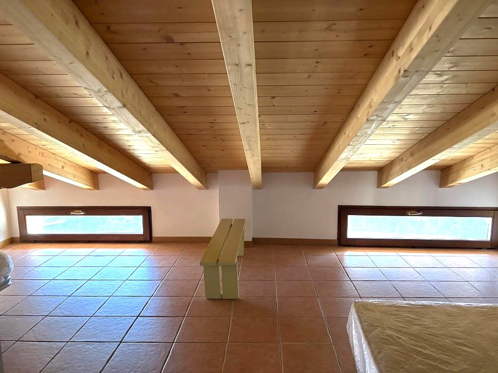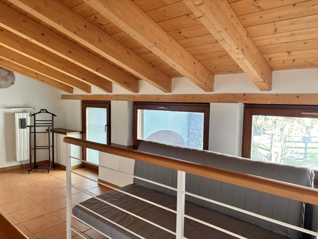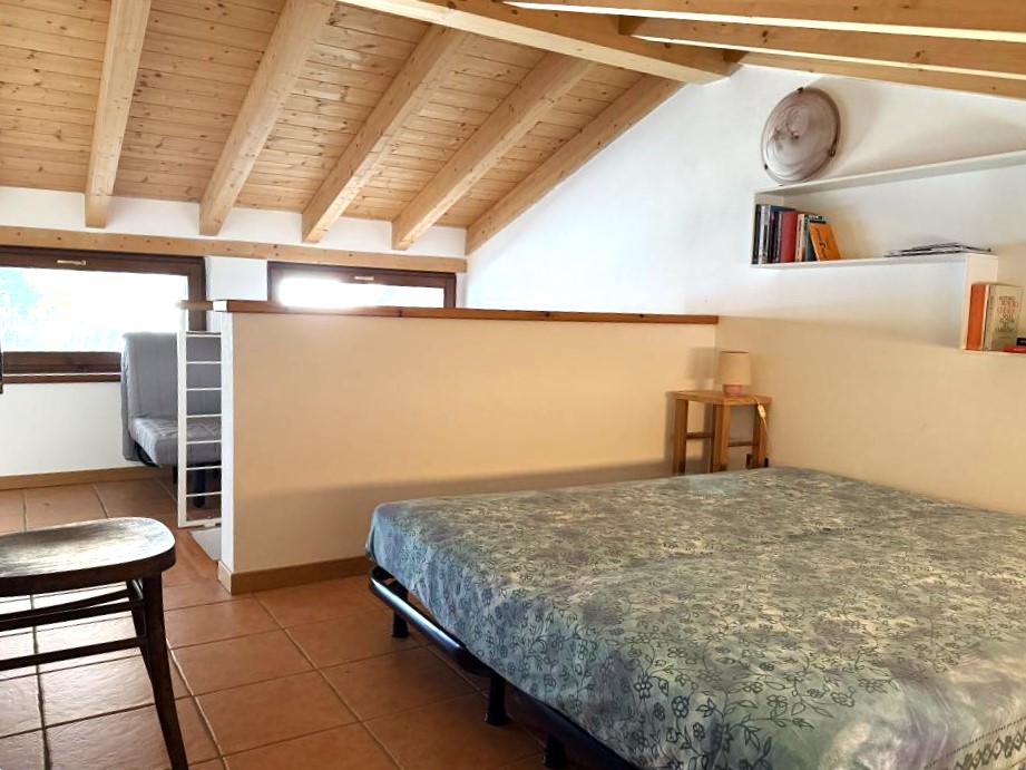 All’interno, il piano terra ospita una spaziosa zona living con cucina a vista e un tipico camino, un ambiente conviviale e accogliente. Da qui si accede alla camera matrimoniale, dotata di terrazzo panoramico con una splendida vista sul lago e sulle colline circostanti, e a un bagno di buone dimensioni.